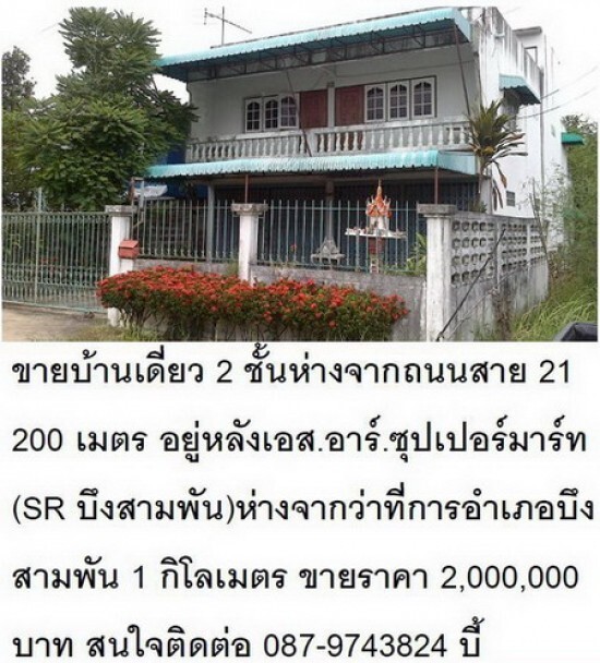 ขายบ้านเดี่ยว 2 ชั้นห่างจากถนนสาย 21 200 เมตร อยู่หลังเอส.อาร์.ซุปเปอร์มาร์ท(SR บึงสามพัน)ห่างจากว่าที่การอำเภอบึงสามพัน 1 กิโลเมตร ขายราคา 2,000,000 บาท สนใจติดต่อ 087-9743824 บี้