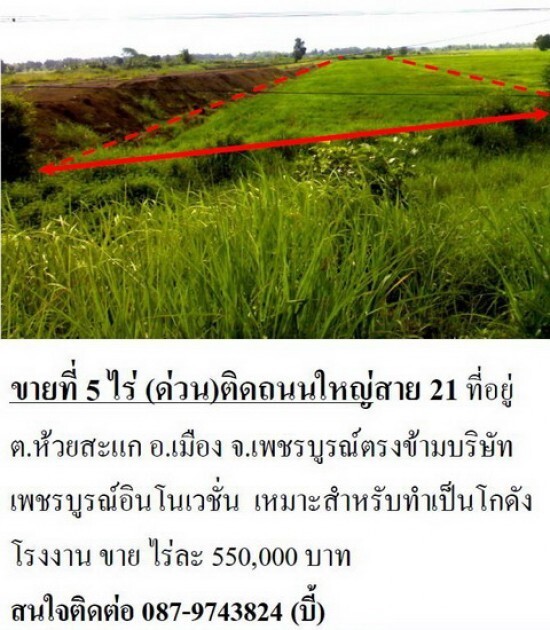 ขายที่ 5 ไร่ (ด่วน)ติดถนนใหญ่สาย 21 ที่อยู่ ต.ห้วยสะแก อ.เมือง จ.เพชรบูรณ์ตรงข้ามบริษัท เพชรบูรณ์อินโนเวชั่น เหมาะสำหรับทำเป็นโกดัง โรงงาน ขาย ไร่ละ 550,000 บาท สนใจติดต่อ 087-9743824 (บี้)