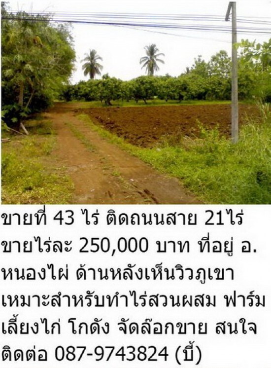 ขายที่ 43 ไร่ ติดถนนสาย 21ไร่ ขายไร่ละ 250,000 บาท ที่อยู่ อ.หนองไผ่ ด้านหลังเห็นวิวภูเขา เหมาะสำหรับทำไร่สวนผสม ฟาร์มเลี้ยงไก่ โกดัง จัดล๊อกขาย สนใจติดต่อ 087-9743824 (บี้)