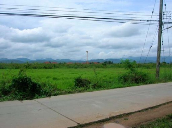 วิวด้านหลังเป็นภูเขาสวย ด้านหน้าและด้านข้างติดถนนคอนกรีต มีลำเหมืองผ่านน้ำไหลตลอดปี