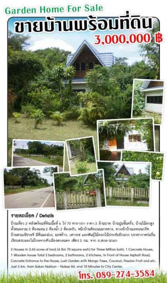 ขายบ้านพร้อมที่ดิน 2 หลังในเนื้อที่ 6 ไร่ 70 ตารางวา ราคา 3 ล้านบาท