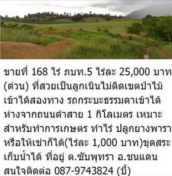 ขายที่ 168 ไร่ ภบท.5 ไร่ละ 25,000 บาท(ด่วน) ที่สวยเป็นลูกเนินไม่ติดเขตป่าไม้ เข้าได้สองทาง รถกระบะธรรมดาเข้าได้ ห่างจากถนนดำสาย 1 กิโลเมตร เหมาะสำหรับทำการเกษตร ทำไร่ ปลูกยางพารา หรือให้เช่าก็ได้(ไร่ละ 1,000 บาท)ขุดสระเก็บน้ำได้ ที่อยู่ ต.ซับพุทรา อ.ชนแดน สนใจติดต่อ 087-9743824 (บี้)