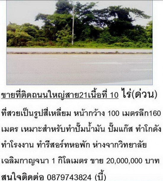 ขายที่ติดถนนใหญ่สาย21เนื้อที่ 10 ไร่(ด่วน) ที่สวยเป็นรูปสี่เหลี่ยม หน้ากว้าง 100 เมตรลึก160 เมตร เหมาะสำหรับทำปั๊มน้ำมัน ปั๊มแก๊ส ทำโกดัง ทำโรงงาน ทำรีสอร์ทหอพัก ห่างจากวิทยาลัยเฉลิมกาญจนา 1 กิโลเมตร ขาย 20,000,000 บาท สนใจติดต่อ 0879743824 (บี้)