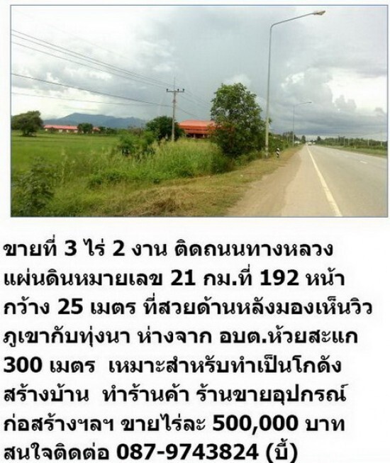 ขายที่ 3 ไร่ 2 งาน ติดถนนทางหลวงแผ่นดินหมายเลข 21ายไร่ละ 500,000