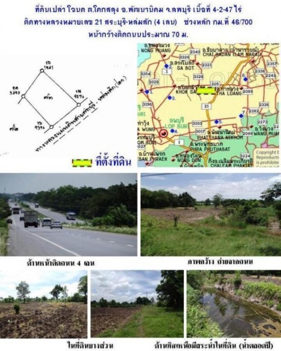 ที่ดินเปล่า เอกสารสิทธิเป็นโฉนด ต.โคกสลุง อ.พัฒนานิคม จ.ลพบุรี เนื้อที่ 4-2-47 ไร่ หน้ากว้างประมาณ 70 เมตร ติดถนน 4 เลน ทางหลวงหมายเลข 21 (สระบุรี-หล่มสัก) กม.ที่ 46/700 จากสระบุรี ขาขึ้น จ.เพชรบูรณ์ เขาค้อ อยู่ด้านซ้ายมือ ด้านทิศเหนือในที่มีสระน้ำเลาะริมที่ดิน ดินดำ ร่วนซุย เหมาะสำหรับผู้ที่เกษียณ ปลูกบ้าน ทำเกษตร ริมถนนใหญ่ ขายไร่ละ 320,000.- ค่าโอนคนละครึ่ง เจ้าของขายเองไม่ผ่านนายหน้า