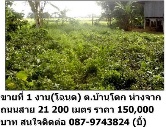 ขายที่ 1 งาน(โฉนด) ต.บ้านโตก ห่างจากถนนสาย 21 200 เมตร ราคา 150,000 บาท สนใจติดต่อ 087-9743824 (บี้)