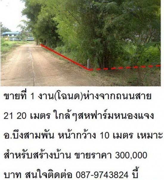 ขายที่ 1 งาน(โฉนด)ห่างจากถนนสาย 21 20 เมตร ใกล้ๆสหฟาร์มหนองแจง อ.บึงสามพัน หน้ากว้าง 10 เมตร เหมาะสำหรับสร้างบ้าน ขายราคา 300,000 บาท สนใจติดต่อ 087-9743824 บี้