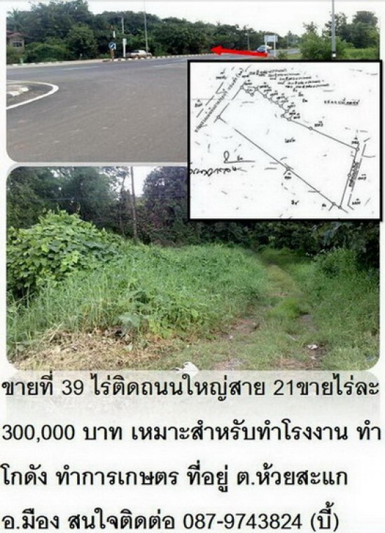 ขายที่ 39 ไร่ติดถนนใหญ่สาย 21ขายไร่ละ 300,000 บาท เหมาะสำหรับทำโรงงาน ทำโกดัง ทำการเกษตร ที่อยู่ ต.ห้วยสะแก อ.มือง สนใจติดต่อ 087-9743824 (บี้) http://www.facebook.com/prokumphaphun