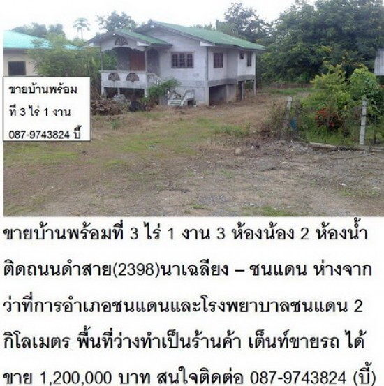ขายบ้านพร้อมที่ 3 ไร่ 1 งาน 3 ห้องน้อง 2 ห้องน้ำติดถนนดำสาย(2398)นาเฉลียง – ชนแดน ห่างจากว่าที่การอำเภอชนแดนและโรงพยาบาลชนแดน 2 กิโลเมตร พื้นที่ว่างทำเป็นร้านค้า เต็นท์ขายรถ ได้ขาย 1,200,000 บาท สนใจติดต่อ 087-9743824 (บี้)