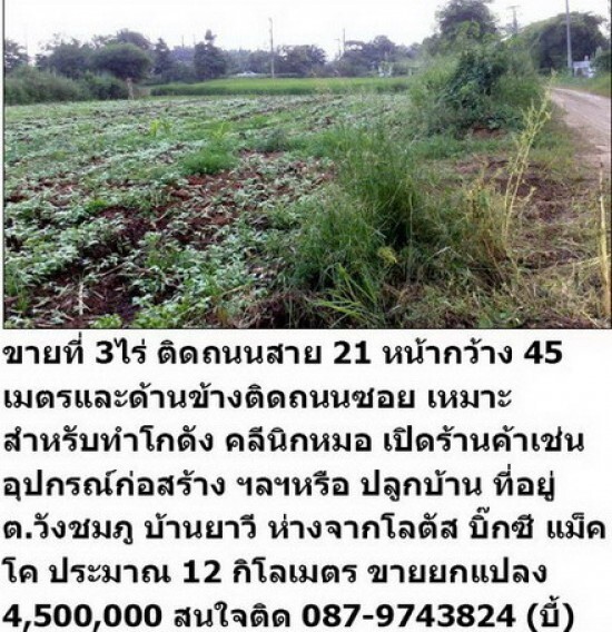 ขายที่ 3ไร่ ติดถนนสาย 21 หน้ากว้าง 45 เมตรและด้านข้างติดถนนซอย เหมาะสำหรับทำโกดัง คลีนิกหมอ เปิดร้านค้าเช่นอุปกรณ์ก่อสร้าง ฯลฯหรือ ปลูกบ้าน ที่อยู่ ต.วังชมภู บ้านยาวี ห่างจากโลตัส บิ๊กซี แม็คโค ประมาณ 12 กิโลเมตร ขายยกแปลง 4,500,000 สนใจติด 087-9743824 (บี้)