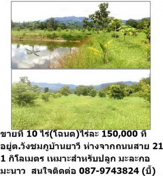 ขายที่ 10 ไร่(โฉนด)ไร่ละ 150,000 ที่อยู่ต.วังชมภูบ้านยาวี ห่างจากถนนสาย 21 1 กิโลเมตร เหมาะสำหรับปลูก มะละกอ มะนาว สนใจติดต่อ 087-9743824 (บี้)