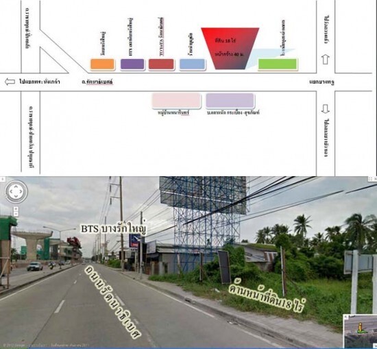 ขายที่่ดิน 18 ไร่ ติดถนนรัตนาธิเบศร์ ใกล้สถานีรถไฟฟ้า บางรักใหญ่ เพียง 100 เมตร ขาย 70,000 บาท/ ตารางวา ไร่ละ 28,000,000 ล้านบาท หน้ากว้าง 40 เมตร ติดถนนรัตนาธิเบศร์ก่อนถึงสี่แยกบางพลู ถ้ามาจากแยกแคราย