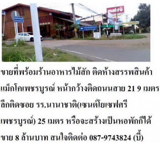 ขายร้านอาหารไม้สัก ติดห้างสรรพสินค้าแม็กโคเพชรบูรณ์ หน้ากว้างติดถนนสาย 21 9 เมตร ลึกติดซอย รร.นานาชาติ(เซนต์โยเซฟศรีเพชรบูรณ์) 25 เมตร หรือจะสร้างเป็นหอพักก็ได้ ขาย 8 ล้านบาท สนใจติดต่อ 087-9743824 (บี้)