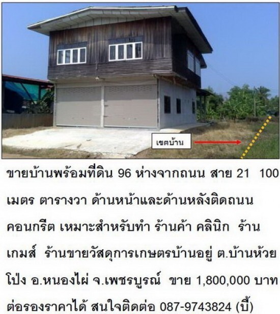 ขายบ้านพร้อมที่ดิน 96 ตารางวา ห่างจากถนน สาย 21 100 เมตร ด้านหน้าและด้านหลังติดถนนคอนกรีต เหมาะสำหรับทำ ร้านค้า คลินิก ร้านเกมส์ ร้านขายวัสดุการเกษตรบ้านอยู่ ต.บ้านห้วยโป่ง อ.หนองไผ่ จ.เพชรบูรณ์ ขาย 1,800,000 บาท ต่อรองราคาได้ สนใจติดต่อ 087-9743824 (บี้)