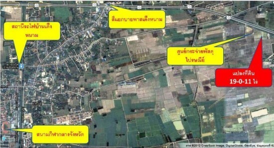 ขายที่ดินติด 19-0-11 ไร่ ติดถนนสี่เลนส์สายบายพาสเต็งหนามติดไปรษณีย์