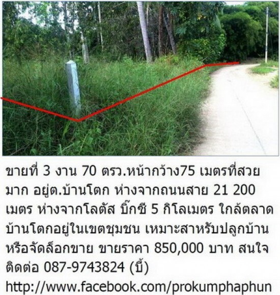 ขายที่ 3 งาน 70 ตรว.หน้ากว้าง75 เมตรที่สวยมาก อยู่ต.บ้านโตก ห่างจากถนนสาย 21 200 เมตร ห่างจากโลตัส บิ๊กซี 5 กิโลเมตร ใกล้ตลาดบ้านโตกอยู่ในเขตชุมชน เหมาะสาหรับปลูกบ้านหรือจัดล็อกขาย ขายราคา 850,000 บาท สนใจติดต่อ 087-9743824 (บี้) http://www.facebook.com/prokumphaphun