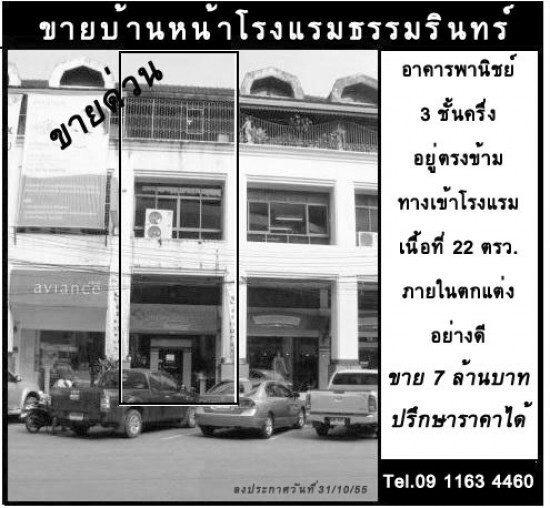 อาคารพานิชย์ 3 ชั้นครึ่งตรงข้ามโรงแรมธรรมรินทร์