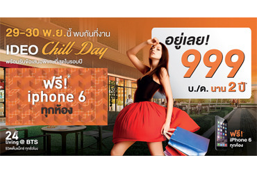 บมจ.อนันดา ดีเวลลอปเม้นท์ ผู้นำตลาดคอนโดมิเนียมติดรถไฟฟ้า ผู้พัฒนาโครงการ “ไอดีโอ สาทร-ท่าพระ” คอนโดมิเนียมพร้อมอยู่ติดรถไฟฟ้าสถานีโพธิ์นิมิตร เพียง 320 เมตร จัดงาน “IDEO Chill Day”ส่งแคมเปญโดนใจ “IDEO Chill Chill Pay” ส่งโปรฯ แรง จองเพียง 999 บาท ทำสัญญา 999 บาท และผ่อน 999 บาทต่อเดือนนาน 2 ปี (เฉพาะธนาคารที่เข้าร่วมโครงการ) พร้อมรับ Iphone 6 ฟรี!! ทุกห้อง (เงื่อนไขเป็นไปตามที่บริษัทกำหนด) ในราคาเริ่มต้น 2.5 ล้านบาท ชวนคุณมาช้อปสนั่นกับร้านค้าแฟชั่นสุดชิค และGadget ดีไซน์เก๋ พร้อมชิมอาหารเมนูเด็ดหลากหลายจาก Food Truck ชื่อดังสไตล์คนเมือง และพิเศษในวันที่ 30 พ.ย.ชมฟรี ! มินิคอนเสิร์ตจากศิลปินชื่อดัง “ลิปตา” แบบใกล้ชิดในบรรยากาศชิลล์ๆ พลาดไม่ได้!! 29-30 พ.ย.นี้ เวลา 14.00-20.00 น. ณ โครงการไอดีโอ สาทร-ท่าพระ สอบถามรายละเอียดเพิ่มเติมได้ที่โทร.02-316-2222 หรือ www.ananda.co.th