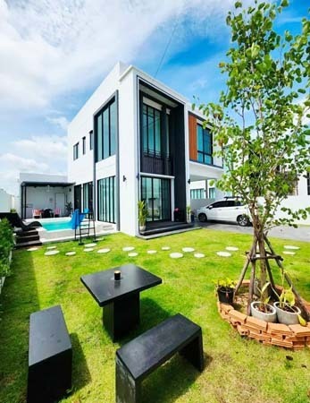 เป็นพูลวิลล่า 2 ชั้น หลังมุม มี 4 ห้องนอน 4 ห้องน้ำ