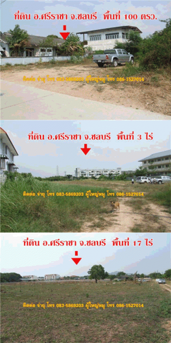 ขายที่ดินอำเภอศรีราชา จ.ชลบุรี ที่ดิน 100 ตร.วา ที่ดิน 3 ไร่ ที่ดิน 17 ไร่ เจ้าของขายเอง