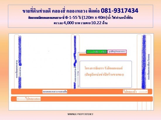 ที่่ดิน 6-1-55 ไร่ ถนน 6 เมตร คลองสี่ มีน้ำ-ไฟฟ้า สร้างโรงงาน โกดัง ห้องเย็น คลังสินค้า โรงแรม บ้านจัดสรร