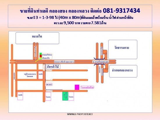ที่ดินเปล่า 1-3-98 ไร่ เหมาะทำโรงแรม หอพัก โกดัง โรงงาน ตรงข้ามตลาดไท คลองหลวง ปทุมธานี หน้ากว้าง 40 เมตร x 80 เมตร ถมแล้วเสมอถนนเกือบเต็ม
