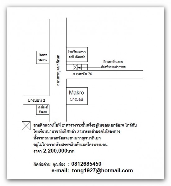 ขายตึกแถวเนื้อที่ 21ตารางวา3ชั้นครึ่งอยู่ในซอยเอกชัย76 ใกล้กับ โรงเรียนนานาชาติเลิศหล้า สามารถเข้าออกได้สองทาง ทั้งจากถนนเอกชัยและถนนกาญจนาภิเษก อยู่ไม่ไกลจากห้างสรรพสินค้าแมคโครบางบอน
