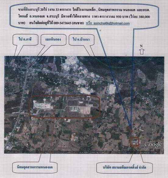 ขายที่ดินสระบุรี 20ไร่ 1งาน 33 ตารางวา ใกล้โรงงานเหล็ก , นิคมอุตสาหกรรม หนองแค และอบต.โคกแย้ อ.หนองแค จ.สระบุรี มีทางเข้าได้หลายทาง ราคา ตารางวาละ 950 บาท (ไร่ละ 380,000 บาท) สนใจติดต่อดูที่ได้ 089-5473645 (สมชาย) หรือ [email protected]