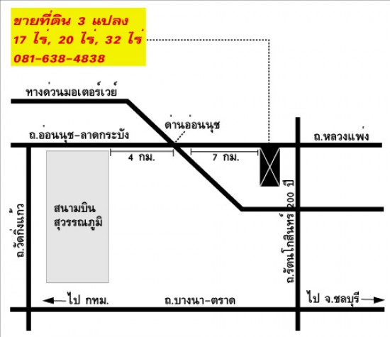 69-2-62 ไร่ ถนนอ่อนนุช-ฉะเชิงเทรา อ. บางบ่อ จ. สมุทรปราการ หน้ากว้าง 120 เมตร ห่างจากสนามบินสุวรรณภูมิ 11 กม. ใกล้โครงการวีอาร์สปอร์ตคลับ, ทางด่วนมอเตอร์เวย์ ไร่ละ 3 ล้านบาท เจ้าของขายเอง ติดต่อ 089-765-7488