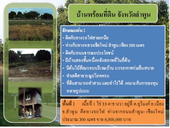 บ้านพร้อมที่ดินเนื้อที่ 1-0-33 ไร่ ห่างจากทางหลวงสายลำพูน-เชียงใหม่ เพียง 300เมตร ตำบลอุโมงค์ อำเภอเมือง จังหวัดลำพูน [[ราคาขาย 6,500,000.00 บาท]]