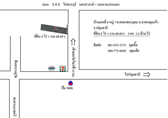 ขายที่ดิน ในซอยวัดไพร่ฟ้า จ.ปทุมธานี เนื้อที่ 4ไร่ 1งาน 68ตรว. ราคา 3.2ล้านต่อไร่