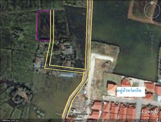แล้วเลี้ยวซ้ายเข้าหมู่บ้านร่มเย็น ซอยแรก (เป็นถนนสาธารณะกว้าง 5 เมตร) ประมาณ 300 เมตร แล้วเลี้ยวซ้าย (เป็นทางสาธารณะกว้าง 4 เมตร) ประมาณ 50 เมตร ถึงที่ดิน