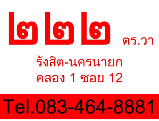 เสนอขายที่ดินเปล่า เนื้อที่ 222 และ 111ตร.วา คลอง1 (สะพานแดง) รังสิตนครนายก ซ.12 ปากซอยมีโลตัล,7-11,ตลาด,อพาร์ทเมนท์บ้านอิงน้ำ เข้าซอย300ม. หน้ากว้าง 40ม.ลึก 22ม. ที่ดินเหมาะแก่การอยู่อาศัยหรือลงทุนสร้างอาคารพาณิชย์,ทาวน์เฮาส์,หอพัก, อ พาร์เมนท์ ก็ดี ทำเลดีเข้าออกสะดวก ถนนคอนกรีตตลอดสาย รองรับการขยายตัวของชุมชนและตลาด อยู่ด้านหลังฟิวเจอร์พาร์คและเมเจอร์รังสิต ไม่ไกลจากดรีมเวิลต์,ตลาดน้ำรังสิต,สวนสาธารณะและมหาวิทยาลัยชั้นนำต่างๆ เดินทางสะดวกด้วยทางด่วนรองรับ3เส้น ทาง(วงแหวนรอบนอก บางนา-บางประอินทร์, ทางยกระดับโทลล์เวย์ และ ทางด่านเอกมัย-รามอินทรา)และโครงข่ายรถไฟฟ้าสายสีแดงเข้ม (บางซื่อ-รังสิต) เจ้าของขายเอง (พร้อมให้คำปรึกษาด้านการลงทุนและก่อสร้างอสังหาริมทรัพย์) สนใจติดต่อ คุณอธิคม โทร 083-464-8881 E-mail: [email protected]