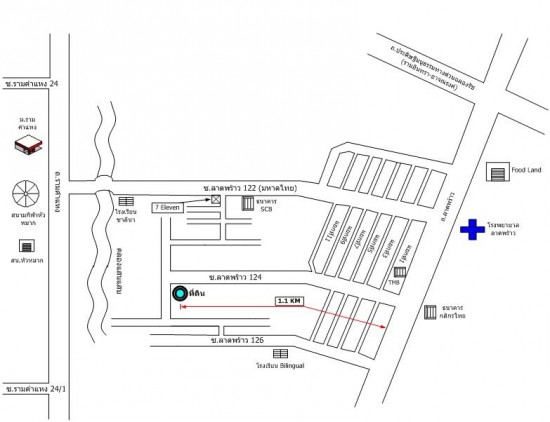 ที่ตั้ง อยู่ลาดพร้าวซอย 124 ติดถนนเมน ห้วมุมติดถนนเมนทั้ง 2ด้าน เข้าออกสะดวกสามารถออกได้ทั้ง ซอย มหาดไทย รามคำแหง65 หรือ ซอยลาดพร้าว 122 และมีทางลัดทะลุออกได้หลายทางเช่น ลาดพร้าว 120, 110, 94 หรือเลียบทางด่วนได้ หรือจะทะลุออก ลาดพร้าว 126, 128, 130 หรือซอยรามคำแหง 81ได้เช่นกัน