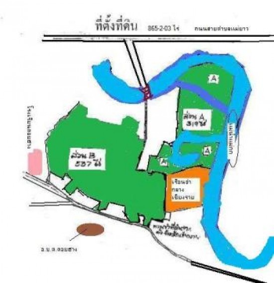 โซน A (ทางขวาของถนนตัดผ่านที่ดินไปจนถึงแม่น้ำกก)391 ไร่ ติดตำบลแม่ยาว