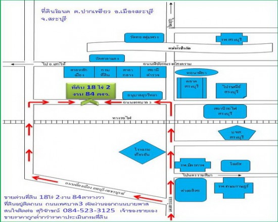 ที่ดินโฉนด ขายยกแปลง เนื้อที่ 18 ไร่ 2 งาน 84 ตารางวา ต.ปากเพรียว อ.เมืองสระบุรี ที่ดินหน้ากว้าง 180 เมตร ทำเลดีการเดินทางสะดวก อยู่ในตัวเมือง ใกล้ศาลากลางจังหวัดสระบุรี และศูนย์ทางราชการ สถานีตำรวจ โรงพยาบาล โรงเรียน วัด ตลาด ที่ดินติดถนนอยู่ที่ถนนเทศบาล3 ตัดผ่านออกถนนบายพาส (ลพบุรี-เพชรบูรณ์) ที่ดินอยู่ติดข้างหมู่บ้านธาราฟ้าใส
