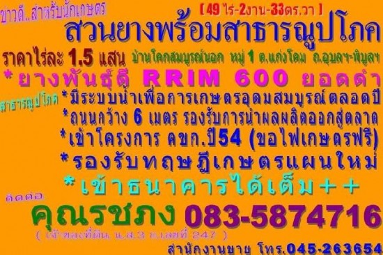 ขายสวนยางพร้อมสาธารณูปโภค 49-2-33 น.ส.3ก. ราคาไร่ละ 1.5 แสนบาท บ้านโคกสมบูรณ์นอก อ.สว่างวีระวงศ์ จ.อุบลราชธานี...รชภง 045-263654 มือถือ 083-5874716