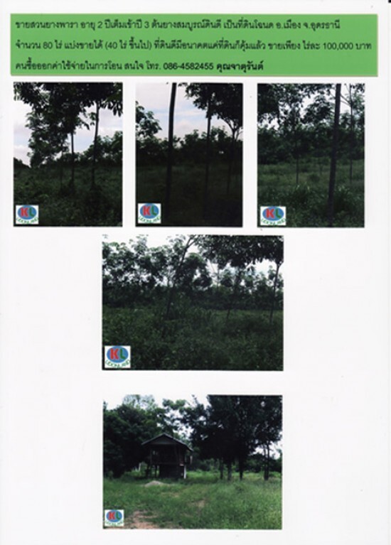 ขายสวนยาง 80 ไร่ อำเภอเมืองอุดรธานี ยางเข้าปี 3 แบ่งขายได้ 40 ไร่ขึ้นไปหรือจะซื้อยกแปลง ขายเพียงไร่ละ 100,000.00 บาท ผู้ซื้อออกค่าใช้จ่ายในการโอนครับ