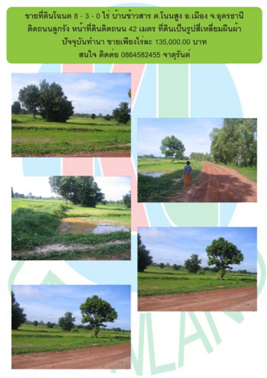 ขายที่ดินโฉนด 8 - 3 - 0 ไร่ บ้านข้าวสาร ต.โนนสูง อ.เมือง จ.อุดรธานี ติดถนนลูกรัง หน้ากว้างติดถุนน 42 เมตร ที่ดินเป็นรูป สี่เหลี่ยมผืนผ้า ปัจจุบันทำนา ขายเพียงไร่ละ 135,000.00 บาท
