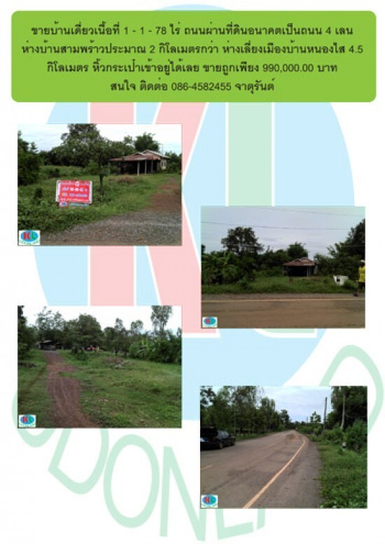 ขายบ้านเดียวชั้นเดียวและที่ดิน 1-1-78 ตารางวา ต.หนองนาคำ อ.เมืองอุดรธานี จ.อุดรธานี ติดถนนลาดยาง ขายถูก อนนาคตเป็นถนน 4 เลนห่างเลี่ยงเมืองสีแยกบ้านหนองใสประมาณ 4.5 กม. หิ้วกระเป๋า จูงลูก จุงเมีย เข้าอยู่ได้เลย ขายถูกๆเพียง 990,000.00 บาท
