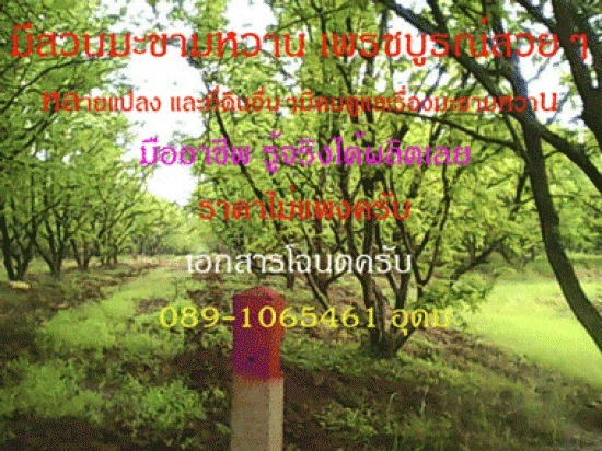 ขายสวนมะขามหวาน 31ไร่ เป็นโฉนดครับ อยู่ในหมู่บ้าน ติดถนนหน้ากว้าง ปลูกบ้านอยู่ได้มีน้ำ-ไฟแล้ว มีรั่วเสาปูนล้อมรอบ หรือถ้าดูแลเป็นระบบเก็บขายได้ปีละหลายแสน รถยนต์จอดได้ถึงที อยู่ในบริเวณที่เรามีคนดูแลอย่างมีระบบ เหมาะกับการลงทุนมาก ไม่กี่ปีก็คืนทุนครับขาย 59,000 บาท (ห้าหมืนเก้าพันบาทต่อไร่) ขายจริงๆ ขายถูกมาก มะขามพันธุ์ดีของเพชรบูรณ์ มีประกายทอง สีทอง ศรีชมภู สวนเป็นที่ราบ มีคนดูแลที่มีความรู้เรื่องมะขามจริงๆ สวย มากครับ หาไม่ได้อีกแล้ว สำหรับที่ อ.หล่มสัก จังเพชรบูรณ์ ติดต่อ 089-1065461 อุดม หรือ อีเมล์ [email protected] หรือwww.udomtidin.com