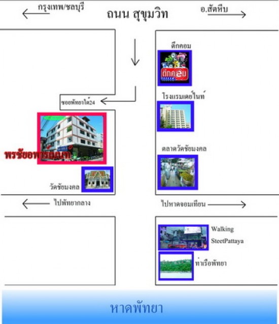 • ฝั่งตรงข้ามปากซอยเป็นตึกคอม ,โรงแรมเดย์ไนท์ และตลาดชัยมงคล ระยะห่างจาก Walking Street ประมาณ 1 กิโลเมตรค่ะ