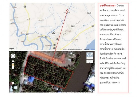 ขายที่ดินแม่กลอง บ้านนางตะเคียน ต.นางตะเคียน อ.แม่กลอง จ.สมุทรสงคราม 5 ไร่ 1 งาน 68 ตารางวา ด้านหน้าติดคลองสุนัขหอน ด้านหลังติดถนน ใกล้วัดลาดเป้ง ,สถานีตำรวจ ,อบต.นางตะเคียน ห่างจากอำเภอแม่กลอง 6 กิโลเมตร ตลาดน้ำอัมพวา 7 กิโลเมตร ตลาดน้ำท่าคา 2 กิโลเมตร เยื้องกับเจริญรัตน์รีสอร์ท เหมาะสำหรับบ้านพักตากอากาศ และรีสอร์ท ที่มีโฉนดไม่ติดพันธะใดๆ สามารถไปดูที่ได้ตลอดเวลา ขายด่วน 12,000,000 บาทเท่านั้น (น้ำไม่ท่วม)สนใจติดต่อ คุณมนตรี 087-1590671