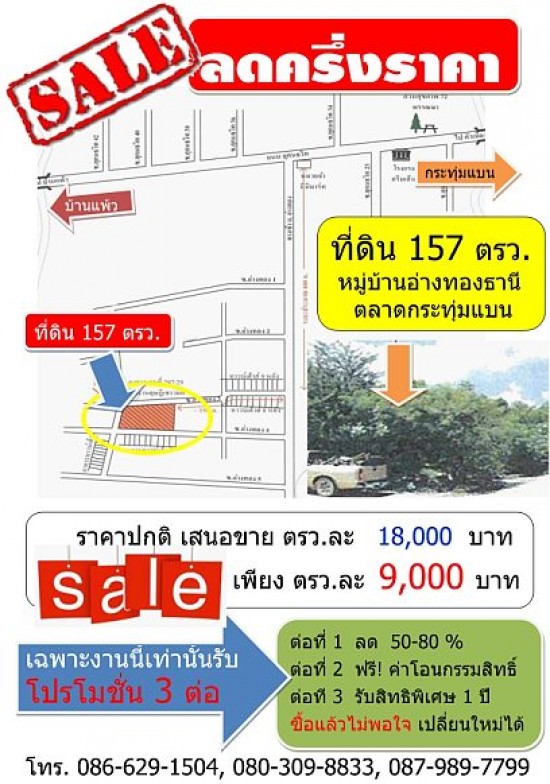 ขายที่ดิน เนื้อที่ 157 ตรว. หมู่บ้านอ่างทองธานี ตลาดกระทุ่มแบน จ. สมุทรสาคร ใกล้โรงงานเซรามิก ราคาปกติเสนอขาย ตรว. ละ 18,000 บาท sale พิเศษเพียง ตรว. ละ 9,000 บาท เฉพาะงานนี้เท่านั้นรับโปรโมชั่น 3 ต่อ ต่อที่ 1 ลด 50 - 80% ต่อที่ 2 ฟรี ! ค่าโอนกรรมสิทธิ์ ต่อที่ 3 รับสิทธิพิเศษ 1 ปี ซื้อแล้วไม่พอใจ เปลี่ยนใหม่ได้
