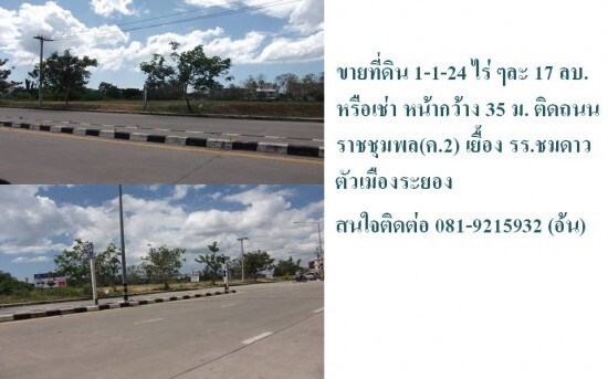 ขายที่ดิน 1-1-24 ไร่ ๆละ 17 ลบ. หรือเช่า หน้ากว้าง 35 ม. ติดถนนราชชุมพล(ค.2) เยื้อง รร.ชมดาว ตัวเมืองระยอง