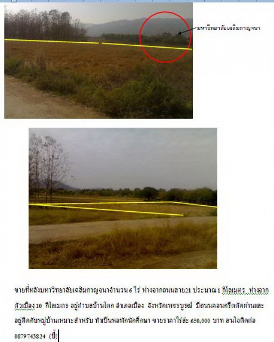 ขายที่หลังมหาวิทยาลัยเฉลิมกาญจนาจำนวน 6 ไร่ ห่างจากถนนสาย21 ประมาณ 1 กิโลเมตร ห่างจากตัวเมือง 10 กิโลเมตร อยู่ตำบลบ้านโตก อำเภอเมือง จังหวัดเพชรบูรณ์ มีถนนคอนกรีตตัดผ่านและอยู่ติดกับหมู่บ้านเหมาะสำหรับ ทำเป็นหอพักนักศึกษา ขายราคาไร่ล่ะ 650,000 บาท สนใจติดต่อ 0879743824 (บี้)