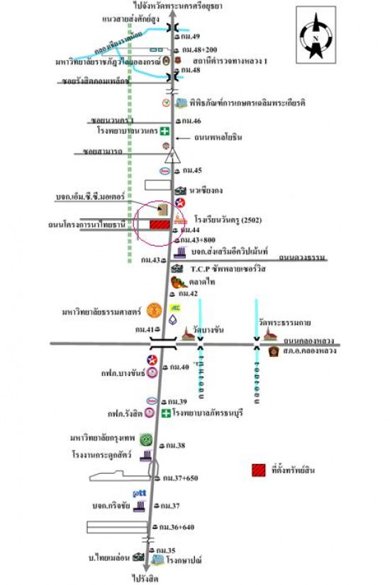 จากรังสิต มุ่งหน้าไป อ.วังน้อย ผ่านมหาวิทยาลัยธรรมศาสตร์(ศูนย์รังสิต) ห่างจาก ม.ธรรมศาสตร์และตลาดไทเพียง 3.00 ก.ม.อยู่ประมาณ กม.44
