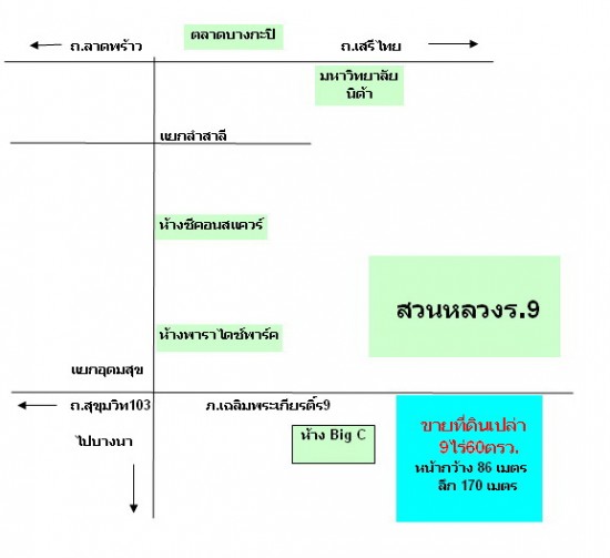 ขายที่ดินประเวศถนนเฉลิมพระเกียรติ์ 9ไร่ ตรงข้ามสวนหลวง ร.9(สุขุมวิท 103) ติดถนนใหญ่ใกล้บิ๊กซี