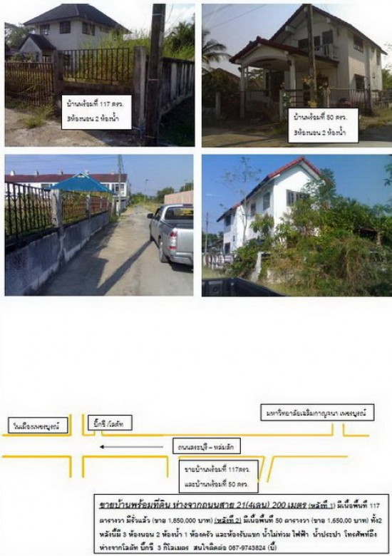 ขายบ้านพร้อมที่ดิน ห่างจากถนนสาย 21(4เลน) 200 เมตร (หลังที่ 1) มีเนื้อพื้นที่ 117 ตารางวา มีรั่วแล้ว (ขาย 1,850,000 บาท) (หลังที่ 2) มีเนื้อพื้นที่ 50 ตารางวา (ขาย 1,650,00 บาท) ทั้ง2 หลังนี้มี 3 ห้องนอน 2 ห้องน้ำ 1 ห้องครัว และห้องรับแขก น้ำไม่ท่วม ไฟฟ้า น้ำประปา โทรศัพท์ถึง ห่างจากโลตัท บิ๊กซี 3 กิโลเมตร สนใจติดต่อ 087-9743824 (บี้)