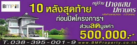 หมู่บ้านบางแสนมหานคร โอกาสเดียวที่คุณจะได้เป็นเจ้าของบ้านเดียว พร้อมสิ่งอำนวยความสะดวกอย่างครบครัน "บ้านดี ราคาดี สังคมดี"ที่หมู่บ้านบางแสนมหานคร กับโปรโมชั่น...ราคาพิเศษ “บ้านสร้างก่อนขาย” บ้านสร้างเสร็จพร้อมอยู่ ส่วนลดสูงสุดกว่า " 5 แสน " บาท รีบจองด่วน...จำนวนจำกัด ก่อนปิดโครงการ ที่สำนักงานขายหมู่บ้านบางแสนมหานคร ถนนลงหาดบางแสน โทร. 038 – 395 001 – 9 www.bmproperty.co.th